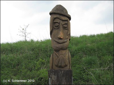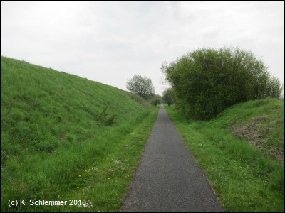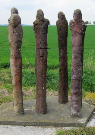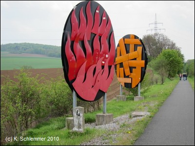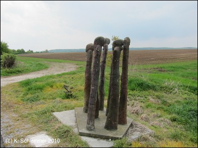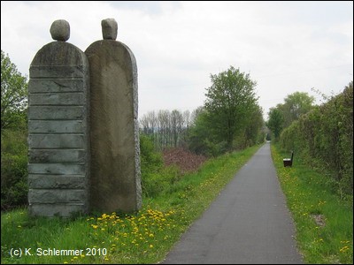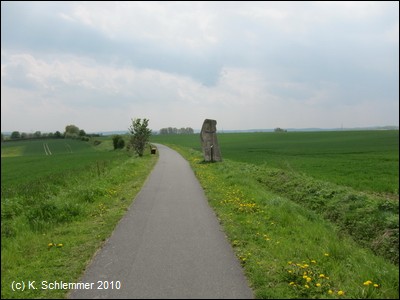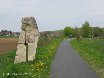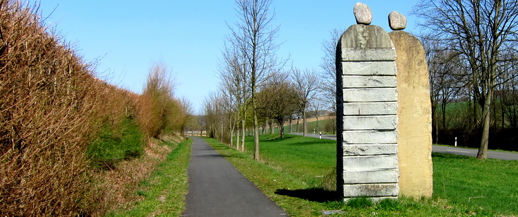 Kerzengerade durchzieht der Radweg die Frühlingslandschaft. Manche Skulpturen, wie diese "Mitra", liegen fast versteckt am Rande der Strecke.