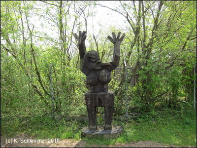 Monumentale Skulpturen bei Kilometer 4: "Freiheit - Liebe - Tod". Weiter talwärts, vor Bad Gandersheim, überqueren wir nochmal eine Brücke.