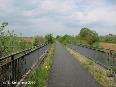 Eine alte Brücke überquert die Trasse. "Begegnung" heißt das folgende Kunstwerk.