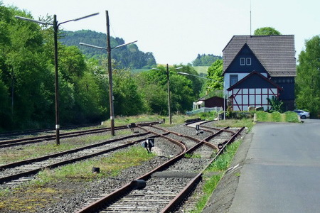Auch die alte Bahnstrecke hat das Werratal erreicht. Der Bahnhof Heimboldshausen der Werratalbahn ist nicht weit, hier fahren aber nur noch Züge des Kalibergbaus.