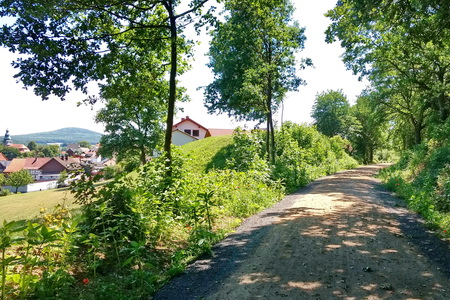 Neben dem Schotterbett der alten Trasse folgt man dem asphaltierten Weg bis zur Kuppe am Ortsrand von Schenklengsfeld.