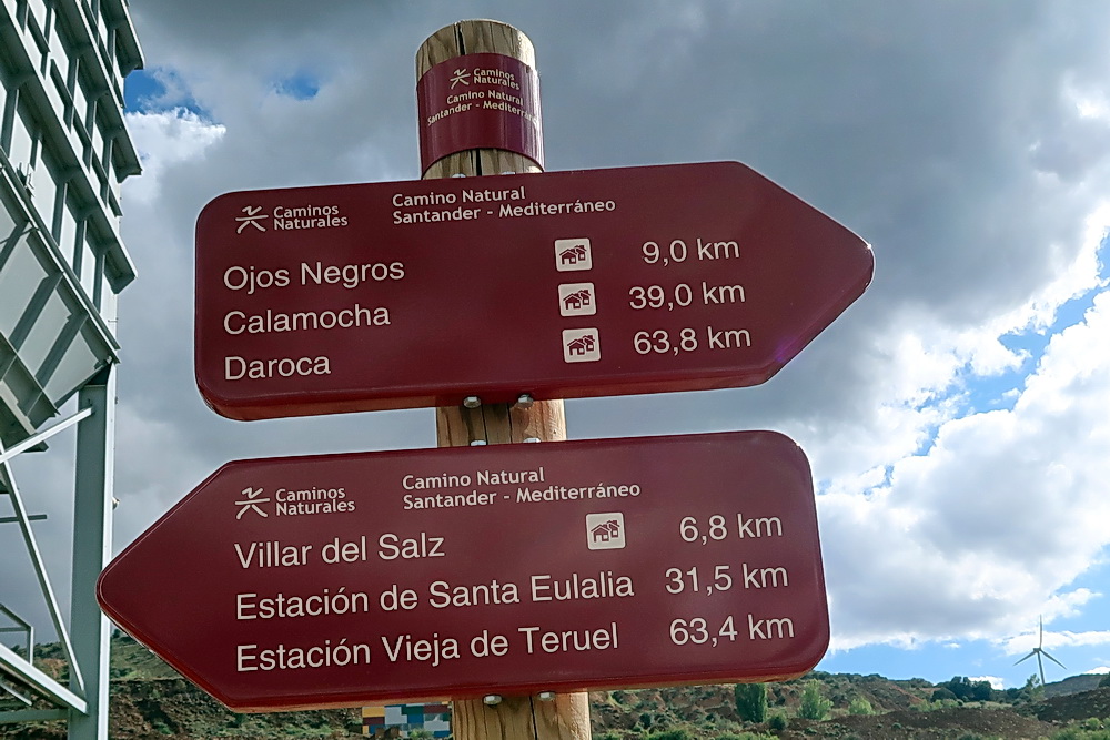 Die Wegweiser sind der Zeit voraus: Einige Abschnitte der legendären Bahnstrecke warten immer noch auf ihre Verwandlung, z:B. Minas de Ojos Negro nach Santa Eulalia Bhf. ist noch nicht fertig (Mai 2024)....