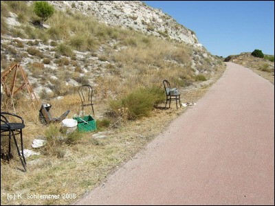 Direkt entlang der Straße geht es bergauf. Dies ist kein Rastplatz: hier hat jemand sein Mobilar entsorgt.