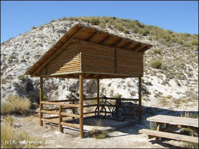Die M-222 zwischen Valdaracete und Brea de Tajo muss überquert werden. Auf der anderen Seite befindet sich wieder ein schöner Rastplatz mit Überdachung und Informationstafeln zur Region und dem Lehr- und Wanderweg (Senda Ecológica).