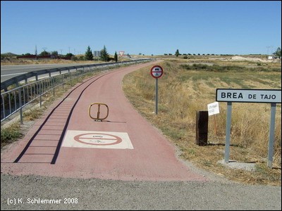 Bei Kilometer 12 rückt der Radweg wieder an die Straße heran. Der Ort Estremera kommt bereits in Sicht. Die Vía Verde endet abrupt an der Straße nach Brea de Tajo 500 m vor dem Ort.