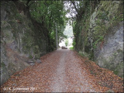Nun sind wir wieder in der Natur, eine Felswand und Befestigungsmauern begrenzen die alte Minenbahnstrecke.