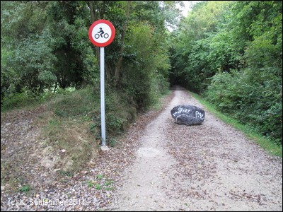 Vorbei an den letzten Häusern der Stadt erreicht man den Wald. Dies ist ein schöner Abschnitt des Radwegs auf der alten Bahnstrecke.