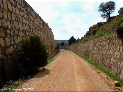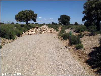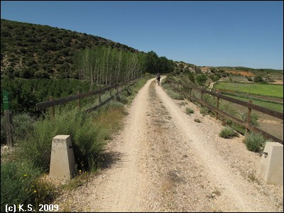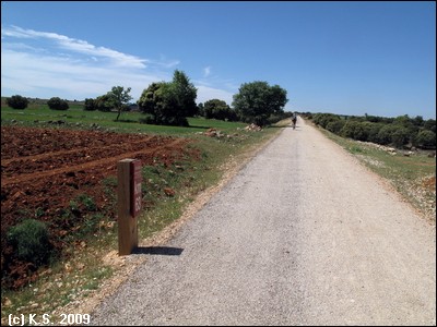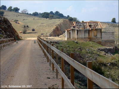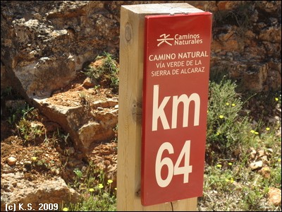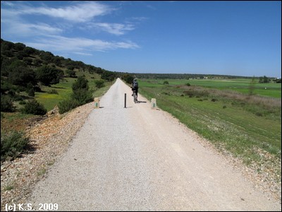Die Strecke danach bis El Jardin und Alcaraz ist ein landschaftlicher Genuss. Dieser Abschnitt ist halbseitig asphaltiert und mit Einschränkungen (Splitt) auch für Rollstuhlfahrer geeignet. Verpflegung gibt es in den (wenigen) Ortschaften - soweit die Gaststätten und Läden geöffnet haben- also wie immer, lieber vorsorgen. Eventuell gibt es Wasser an den neuen Rastplätzen El Jardín und El Robledo (2009 teils schon wieder defekt).