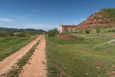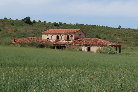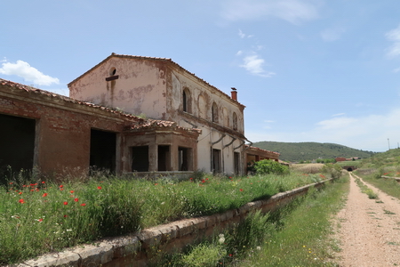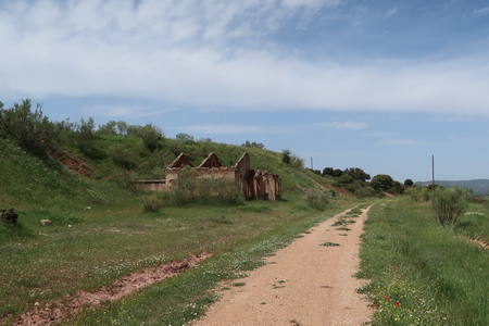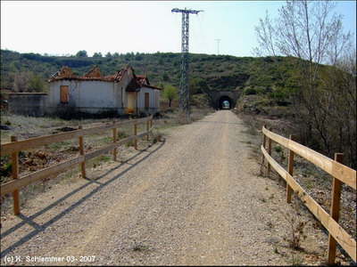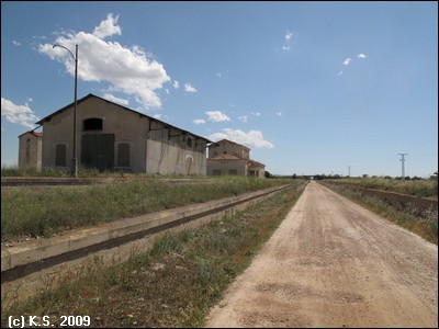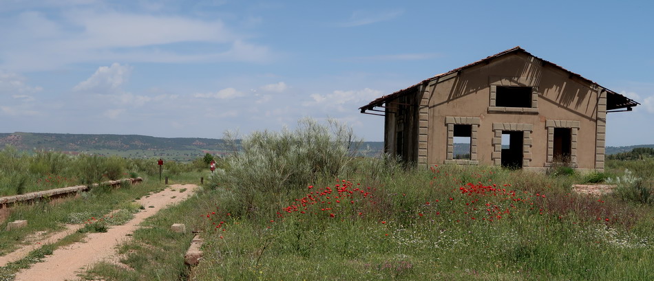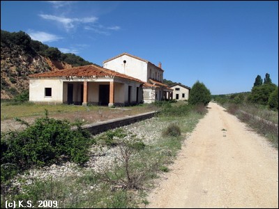 Die Ruine eines Bahnhäuschens (?). Eine breite Trasse in Richtung Villapalacios.