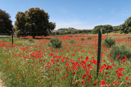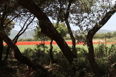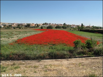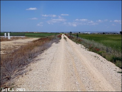 Auf dem Seitenstreifen der Nationalstraße 5 km bis zum nächsten Abzweig hinter dem Bahnhof Balazote- Blick auf die blühenden Felder.