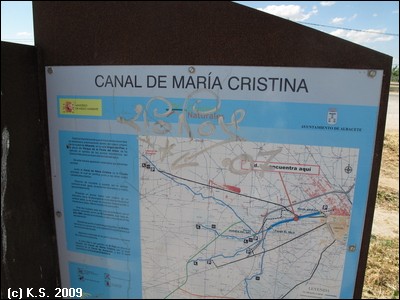 Hier auf der Nordwestseite der Stadt Albacete, in der Calle Virgen del Pilar, steht diese Infotafel. Man folgt der Beschilderung entlang des Canal de María Christina und Acequion oder dem Kanal Ojos de San Jorge.