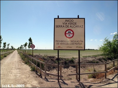 Der erste Teil der Strecke führt durch die Llanos der Mancha (Albacete). Lange Geraden dominieren, man trifft auf kein einziges Dorf direkt an der Strecke. Es gibt keine Unterstellmöglichkeiten im Falle von Regen oder Gewitter. Für ausreichend Verpflegung, aber besonders auch für Eigenhilfe bei Pannen am Fahrrad ist vorzusorgen! Wenn man Glück hat, trifft man ein paar Landarbeiter, die die riesigen, bewässerten Felder betreuen, oder einen der Arbeiter, die den mächtigen Kanal Trasvase Tajo-Segura, der den Radweg kreuzt, instand halten. Die Via Verde beginnt ca. 6 km vom Stadtzentrum von Albacete entfernt am nordwestlichen Stadtrand. Der Beginn ist nicht mit dem Auto erreichbar. Man parkt am besten in der Nähe der Calle Lérida und folgt dem Radwegen entlang der Kanäle Maria-Christina und Acequión (gut ausgeschildert) bis zum Startpunkt in der Nähe der Ansiedlung Casa Viejas (Eventuell auch dort Parkmöglichkeit, wegen der neuen A-32 aber für Ortsfremde unübersichtliche Anfahrt). Nur ein sehr kurzer erster Abschnitt ist asphaltiert, dann folgt eine Strecke mit Feldwegcharakter, später auch mit grobem Splitt und Schotter gespickt, sowie mit reichlich Schlaglöchern. Besonders der Abschnitt jenseits der Kreuzung mit dem Kanal erfordert ein stabiles Fahrrad, am besten gefedert und mit guten, pannensicheren Reifen! Dann beginnt eine über 25 km lange Strecke durch die Llanos von Albacete. Schier endlos erscheint die eintönige, recht "naturbelassene" Strecke. Durch riesige bewässerte Felder und über den mächtigen Kanal Trasvase Tajo-Segura führt der Radweg, auch große Brachflächen mit vertrockneten Bäumen und Pflanzenwerden durchquert.