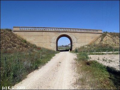 Die Beschilderung ist marode, der Weg ist Teil der Ruta de Don Quijote, die nach der Brücke rechts abbiegt und weitab der Bahntrasse durch die Felder führt.