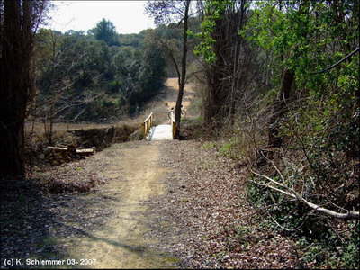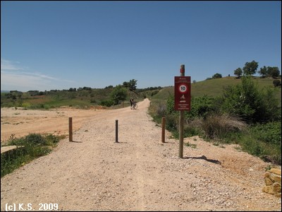 Durch den Durchlaß verlief die alte Bahntrasse. Doch für ca. 1,4 km ist die Trasse nicht ausgebaut. Hier nicht rechts abbiegen - der Weg führt nur zur Deponie - sondern geradeaus zum Ortseingang. Dann ca. 1,5 km der Straße folgen, und bei der Abzweigung recht fahren. Hier geht es einen kleinen Abhang hinauf auf die Trasse.