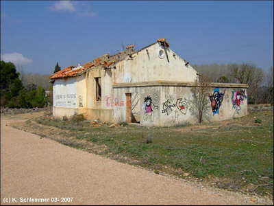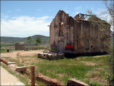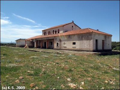 "Gefährliche Kreuzung* - kein Mensch in Sichtweite, Der Bahnhof Bienservida, eine Ruine wie all die übrigen Gebäude der Bahnstrecke.