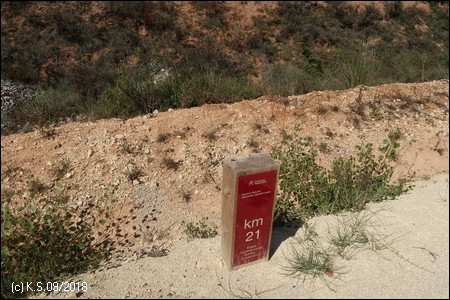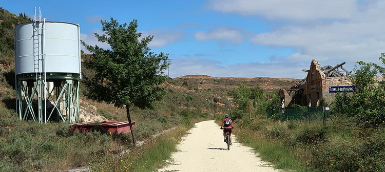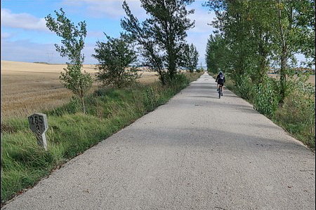 Es folgt zunächst eine schier endlose Gerade. Die Kilometrierung ist eher willkürlich: Kilometer 262 der Bahnlinie entspricht hier Kilometer 22 des Radwegs, Kilometer Null liegt am nördlichen Ende des kleinen Ortes Qintanarruz (17 Einw.) etwa bei Bahnkilometer 284.
