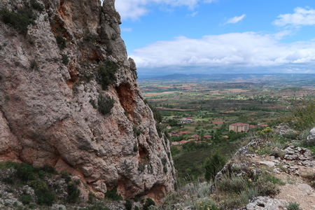 Der Scheitelpunkt der Strecke ist nicht mehr weit! Unterhalb des schroffen Felsens liegt der Ort Peñahorada, mit zwar nur noch 26 Einwohnern, aber bei den Sportkletterern der Region wohl bekannt. Die Straße CL-629 muss überquert werden, der Höhenmesser zeigt 904 m ü.NN. Ab hier geht es gemächlich bergab.