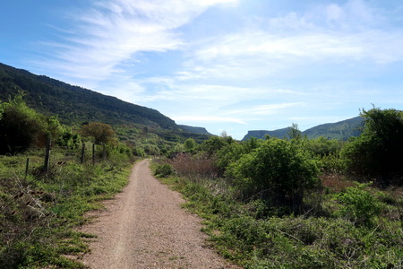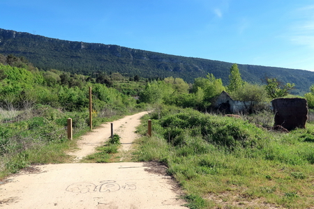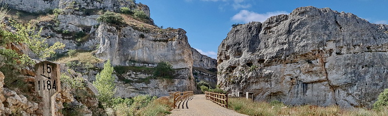 Wir beginnen hier einen neuen Abschnitt neuen Abschnitt, da die Kilometrierung des Radwegs ohnehin etwas unorthodox erscheint und nicht mit der Kilometrierung der Bahnstrecke korreliert. Die Landschaft Richtung Cidad Dosante durchquert die felsigen Schluchten Desfiladero de Rio Oca und Desfiladero de la Horadada und folgt den Flussläufen des Rio Oca, des Rio Ebro und des Rio Nela.