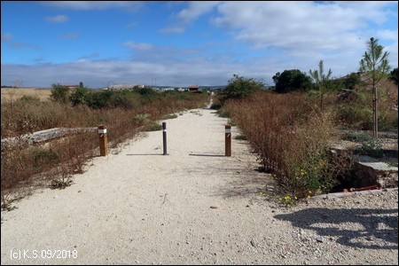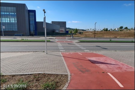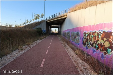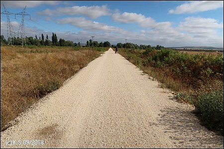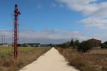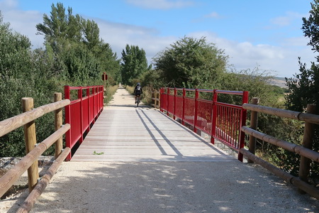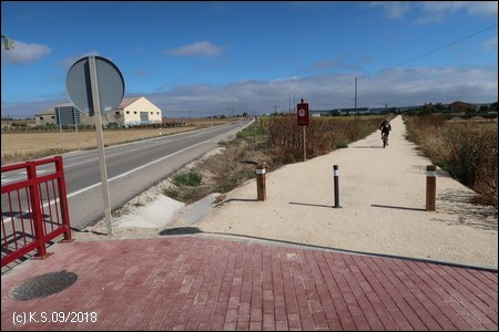 Weniger gut zu finden ist ohne GPS der Ausgangspunkt der Vía Verde, der ca. 9 km nördlich inmitten der Felder beginnt. Wegweiser haben wir vergeblich gesucht. Jenseits der Industriegebiete am nördlichen Stadtrand bei dem kleinen Ort Sotragero beginnt (oder endet) die ausgebaute Strecke - etwa bei Kilometer 22 des Radwegs. Die folgende Beschreibung ist eine Möglichkeit, den Startpunkt mit dem Fahrrad zu erreichen. Um den Burgberg zu umgehen kann man zunächst dem Radweg am Rio Arlanzon flussabwärts folgen (ca. 1,5 km), überquert dann den Fluss an der Avenida de la Universidad. Am nächsten Kreisverkehr (Avenida Oscar Romero) beginnt ein roter Radweg, der am großen Friedhof (Cementerio Municipal San José) vorbei in das Industriegebiet im Norden der Stadt führt.