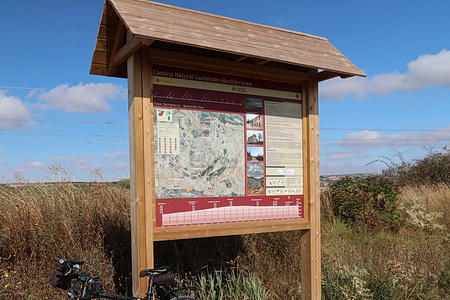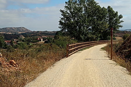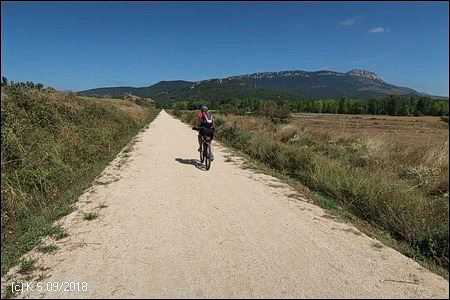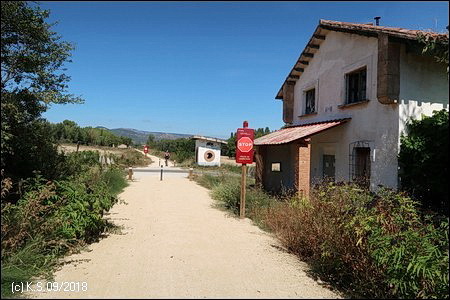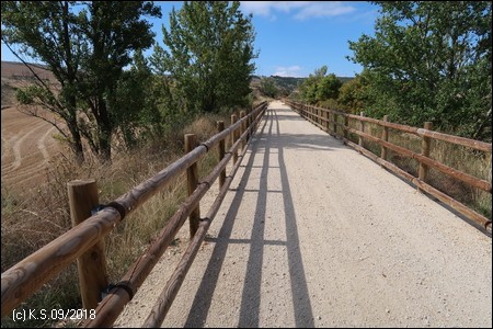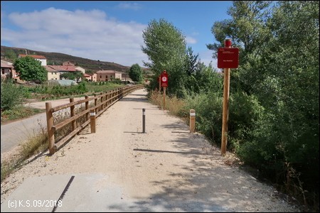 Eine Infotafel und ein Wegweiser, so beginnt der Radweg "La Bureba". Ein holpriger Feldweg, teils zugewachsen, führt auf der Trasse zurück Richtung Burgos, wo die alte Bahnstrecke von Straßen und Industrieanlagen überbaut wurde. Die Vía Verde selbst ist nicht asphaltiert, sondern erhielt eine Decke aus festgewalztem Splitt und Sand, an manchen Stellen auch schon wieder recht lose.