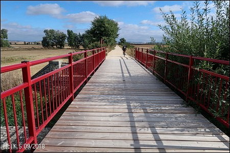 Überquerung des Río Ubierna auf einer roten Brücke mit neuem Holzbelag, dann Unterquerung der Autobahn A-73. Auch danach geht es schnurgerade weiter, KIlometer 265,3, die ungeraden Hektometersteine immer links.