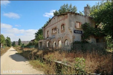 Bahnhof Peñahorada, einst ein stattliches Gebäude, heute nur noch ein baufälliges Skelett, ebenso wie die Nebengebäude. Noch lange zieht sich der Bahnsteig an der Trasse entlang.