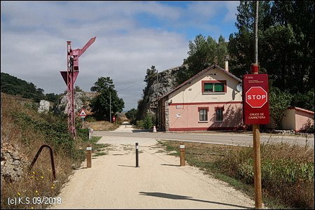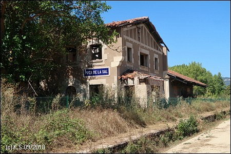 Die Straße nach Poza de la Sal. Der touristisch interessante Ort (ca. 350 Einw.) mit seiner Burg liegt ca. 2 km abseits der Trasse. Der stattliche Bahnhof ist, wie so oft an dieser Strecke, eine Ruine.