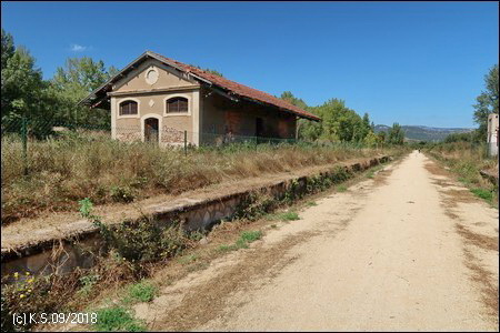 Fast unmerklich geht es bergauf, die schroffen Felshänge bleiben zurück, die Landschaft öffnet sich. Vorbei an einem alten Gemäuer (wahrscheinlich eine Verladeeinrichtung des nahen Steinbruchs)), dann kommt der nächste Bahnhof in Sichtweite.