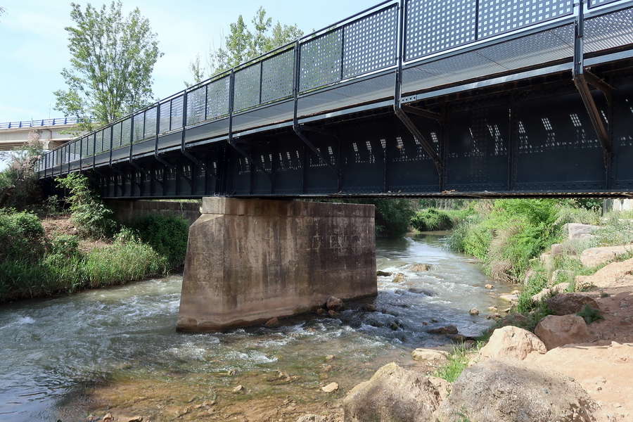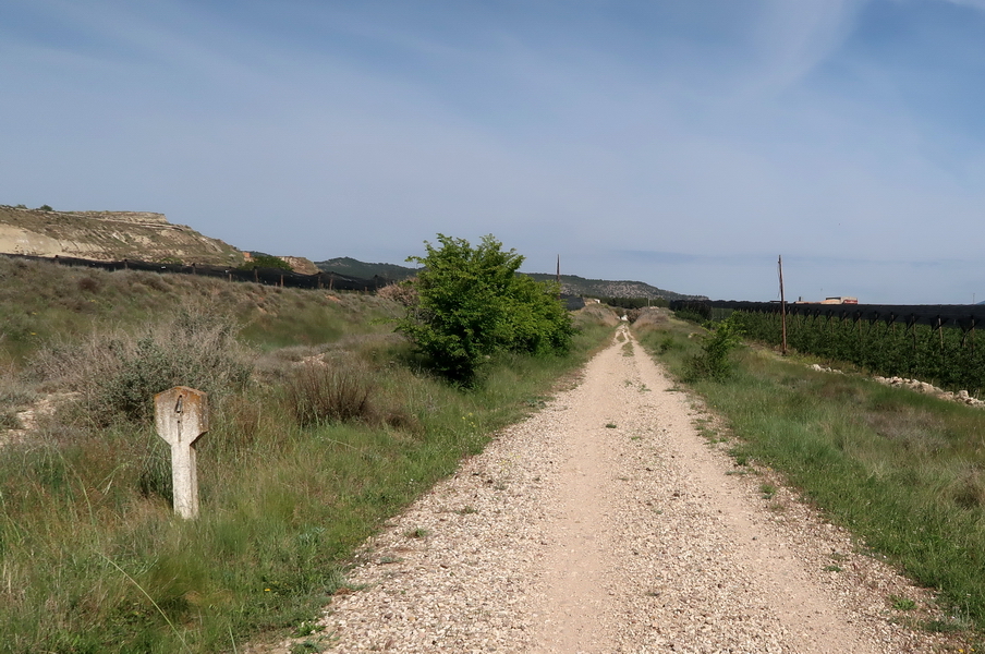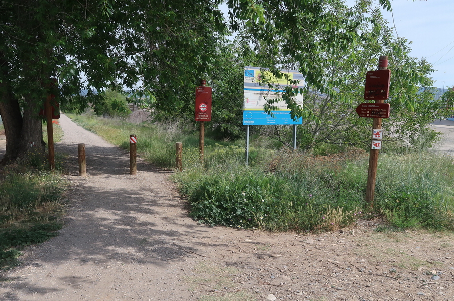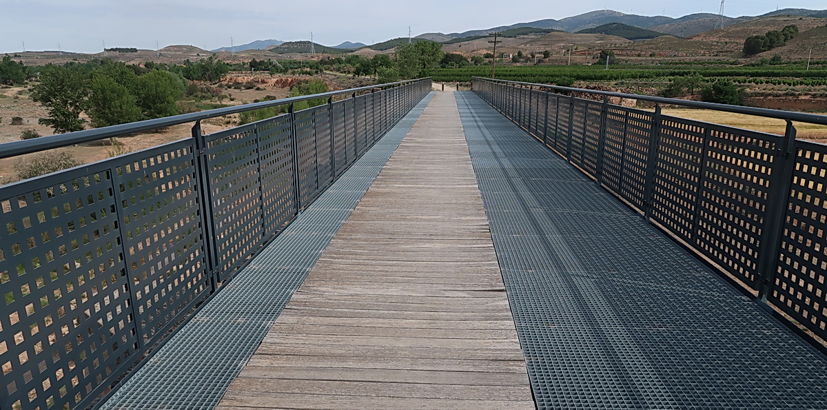 Auf dem ehemaligen Brückenkopf gibt es einen kleinen Rastplatz, weiter auf der Trasse folgt man wieder einem steinigen Weg. Wir sind bei Kilometer 4,1 der Bahnlinie. Die parallel verlaufende N-234 ist kaum zu hören, denn wir fahren durch einen tiefen Einschnitt.