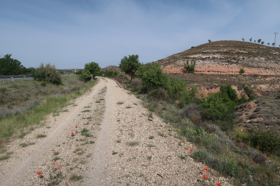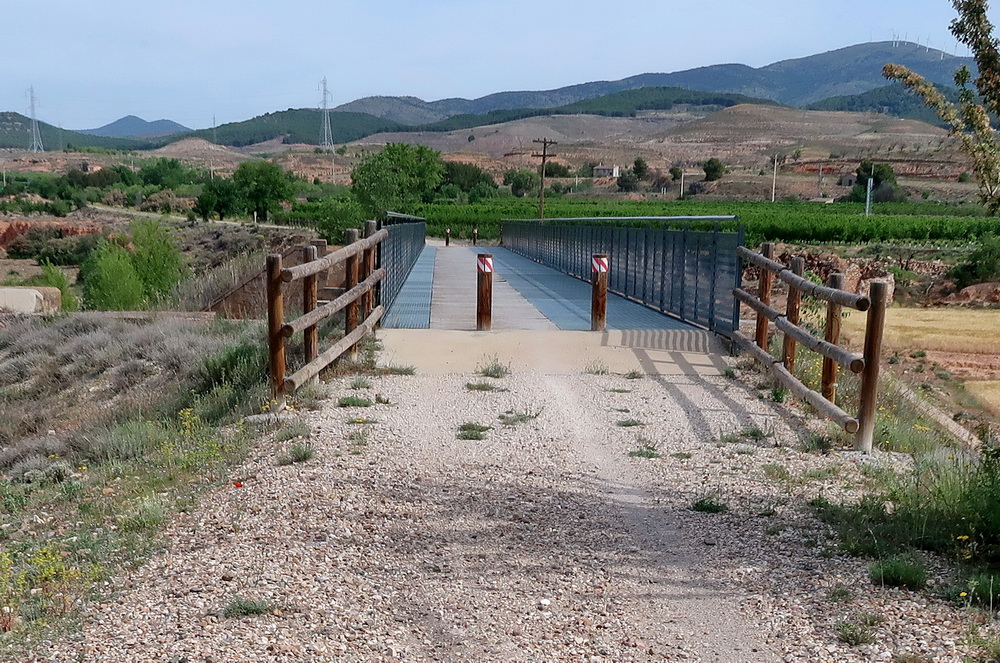 Die Fahrbahn ist steinig und rutschig, aber gesäumt von Blüten (Mai 2004). Schon bald erreicht man den Río Jalón. Die Nationalstraße und der Radweg überqueren den Fluss.
