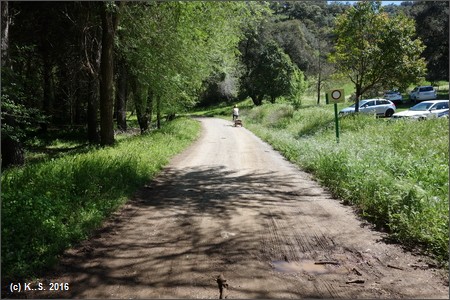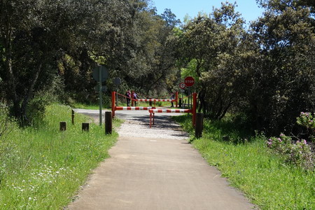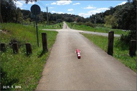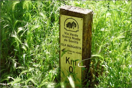 Um zum Beginn der Vía Verde zu gelangen, muss man die Bahnstrecke überqueren. Wegweiser führen zum Beginn des Radwegs am Parkplatz beim Freizeitgelände Isla Margarita. Kilometer Null!
