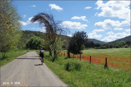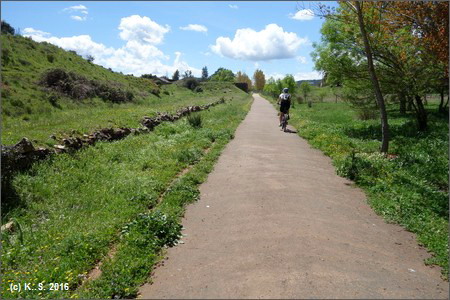 Der Radweg hat deutlich an Höhe gewonnen. Durch eine breite Schlucht...