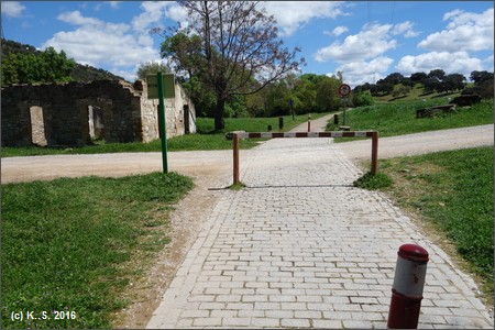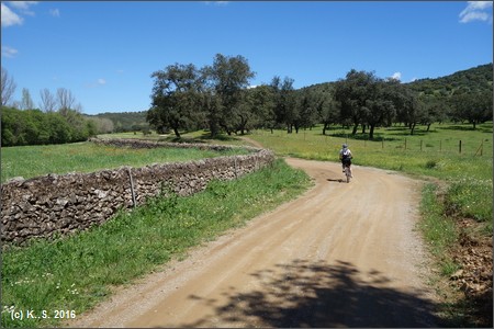 Kein Steinschlag, aber auch gefährlich: Klappsperre auf der Fahrbahn. Nun geht es durch die "Dehesa", eine typische Landschaftsform in Südspanien mit Weideland und Baumbestand.