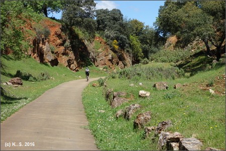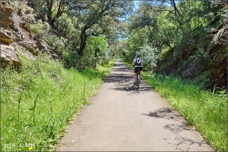 Nicht direkt vor den Toren Sevillas liegt dieser Radweg: Gut 88 km fährt man auf kurvigen Straßendurch die Berge der Region! Die Anreise mit der Bahn ist möglich, wenn da nur nicht der ausgedünnte Fahrplan wäre: (Fahrplan vom 07.02.2016): Der Regionalexpress von Sevilla (Bhf. Santa Justa) nach Mérida und Cáceres fährt einmal am Tag um 17:20 ab und erreicht nach 1 1/4 Stunden den Bahnhof Cazalla-Constantina. Der Transport der Räder im Regional-Express muss wahrscheinlich angemeldet werden (vorher abklären!) In Gegenrichtung fuhren 2016 ganze 2 Züge, 10:08 und 11:24 ab Cazalla nach Sevilla. Die Cercanias (Nahverkehr) der Linie C3 ab Sevilla S.J. fahren 3x am Tag in beiden Richtungen, die Zeiten sind im Internet abrufbar (http://www.redtransporte.com/sevilla/cercanias-renfe/horarios.html, - ohne Gewähr, Stand: Sommer 2016) Vom Bahnhof Cazalla aus sind es 1,4 km zum Beginn des Radwegs am Parkplatz (Wegweiser). Der Ort Cazalla de la Sierra ist 8,5 km vom Bahnhof entfernt, der Ort Constantina 12,5 km.