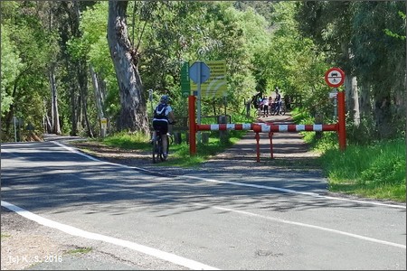 Die Straßenquerungen sind durch Schranken gesichert. Felsige Einschnitte in den Berghang.