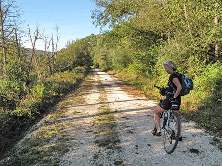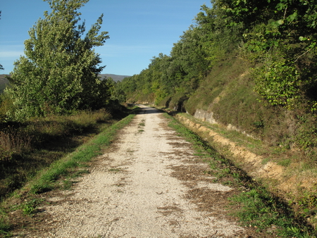 Wir haben die Grenze von Kantabrien nach Kastilien und Leon überquert. Der Abschnitt der Bahnstrecke des Ferrocarril Santander-Mediterráneo, der von der Verzweigung vor Cidad Dosante zum Bhf. Valdeporres (bei Santelices) zum Südportal des Tunnels von Engaña führt, ist als Radweg ausgebaut. Knapp 7 km beträgt die Strecke, die in einem konstanten, sanften Anstieg zu den verlassenen Ruinen der ehemaligen Ansiedlung am Bahnhof vor dem Tunnel führt. Seit unserer Erstbefahrung 2011 ist der Ausbau des Viadukts über den Río Nela ca. 1 km südlich von Santelices(Valdeporres) hinzugekommen, so dass der inzwischen ausgebaute Abschnitt im Jahr 2024 ohne Unterbrechung befahrbar ist.