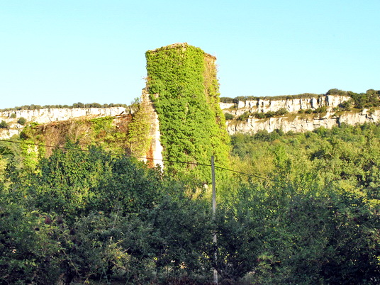 Vor Rozas geht es durch einen tiefen Einschnitt. Unter dichtem Efeubewuchs versteckt sich die Ruine der Kirche von Rozas (2011). Der Ort hatte 2021 noch 15 Einwohner.