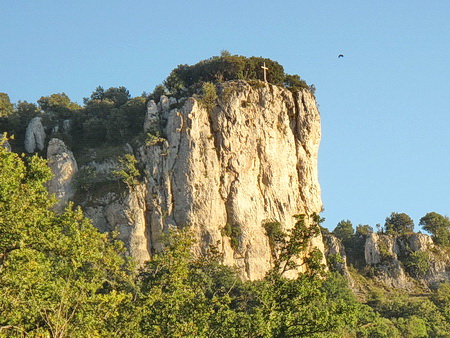 Das Empfangsgebäude wird privat genutzt. Blick zurück zum Lagerhaus und den Felswänden hoch über dem Radweg.