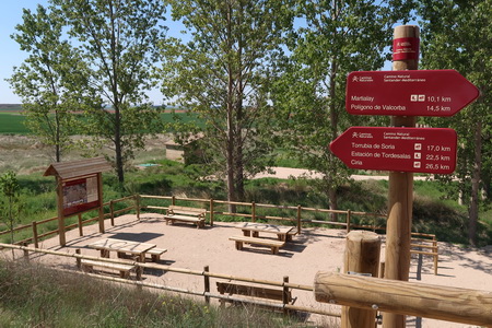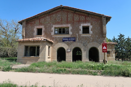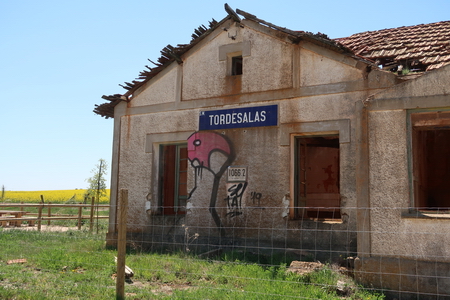 Haltepunkt Torrubia de Soria mit Wartehäuschen, gut bei Regen und zu viel Sonne! Wenig weiter erreicht man Tordesalas bei Kilometer 37des Radwegs. Auch dieser Bahnhof ist nur noch eine Ruine, aber mit einem Rastplatz (ohne Schatten).