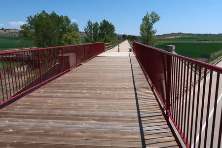 Brücke über den Río Rituerto (Nebenfluss des Duero) bei Kilometer 71,3 der Bahnstrecke. Rechts in der Ferne auf dem Hügel erkennt man die Ruinen des Ortes Albocabe und der Kirche Santa María de la Mayor, in etwas über 1000 m Höhe gelegen. Die letzten Bewohner verließen den Ort in den 1960er Jahren.
