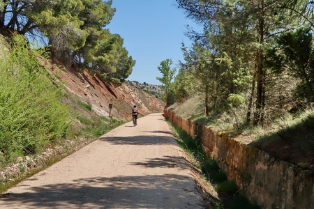 Die stillgelegt Bahnstrecke des Ferrocarril Santander-Mediterráneo verlässt den Bahnhof Soria-Cañuelo (1044 m ü.NN.) durch den rechten Tunnel Richtung Rio Duero. Um den Burgberg herum und über die alte Eisenbrücke geht es hinauf in die Hochebene. Zum Beginn der Vía Verde im heutigen Industriegebiet von Valcorba nahe dem alten Bahnhof (Ruine) musste man 2022 noch auf der Straße fahren, der Anschluss zwischen der Stadt und dem neuen Radweg auf der alten Bahntrasse soll aber demnächst gebaut werden. In etwa 1000 m über dem Meeresspiegel dominieren lange gerade Abschnitte ohne wesentliche Steigungen oder Gefälle. Erst ab dem Bahnhof Portillo de Soria (1024 m ü.NN.) nach etwa 28 Kilometern Fahrt, beginnt ein sanfter Anstieg nach Tordesalas (1066,2 m ü.NN.), dem Scheitelpunkt dieses Abschnitts. Die letzten 6,5 km bis zur Provinzgrenze nach Aragón geht es durch die schroffe Gebirgsbarriere der Sierra de la Vigornia hinab auf 1016 m ü.NN., vorbei an der maurischen Burg Castillo de Ciria, die an der Steilwand gegenüber empor ragt. Durch den 245 m langen, beleuchteten Túnel de Ciria abwärts erreicht man das abrupte Ende des Ausbaus nach 2 km, noch vor der Brücke über den Río Manublas (Prov. Aragón).