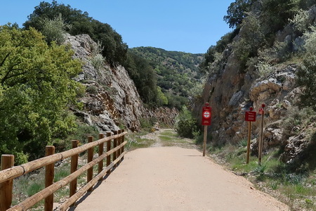 Nun geht es begab. Der Einschnitt der Bahntrasse ist von Erosion gezeichnet, Weiter talwärts verengt sich da Tal zu einer felsigen Schlucht, die der Río Manubles geformt hat.