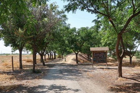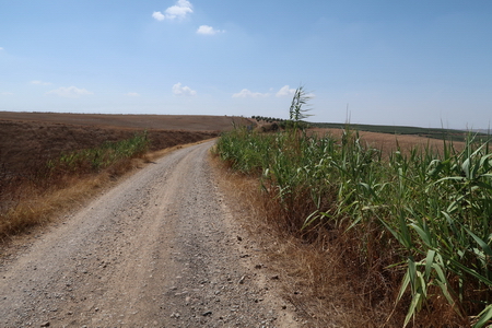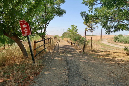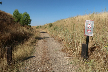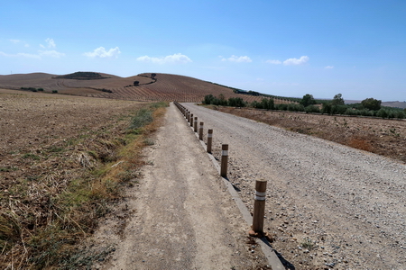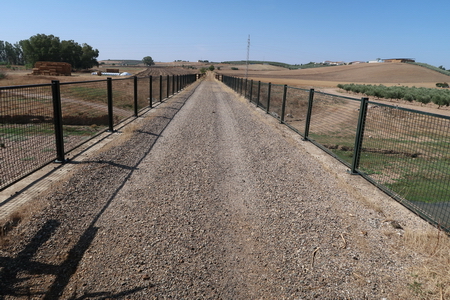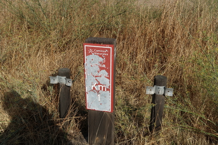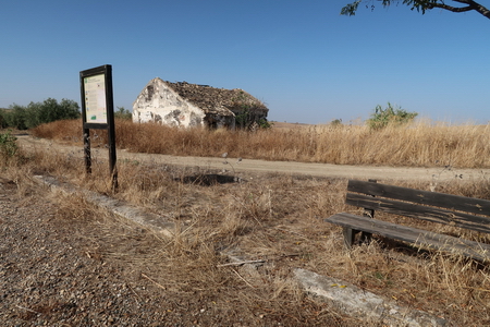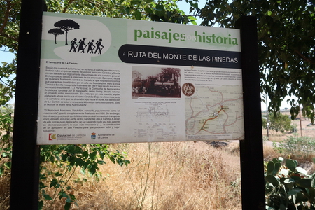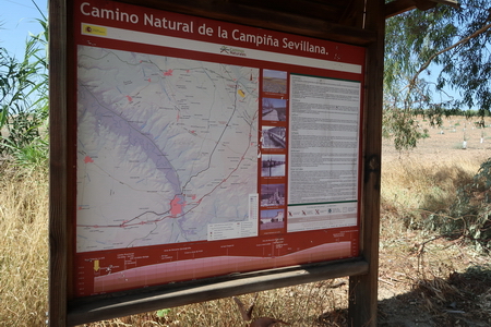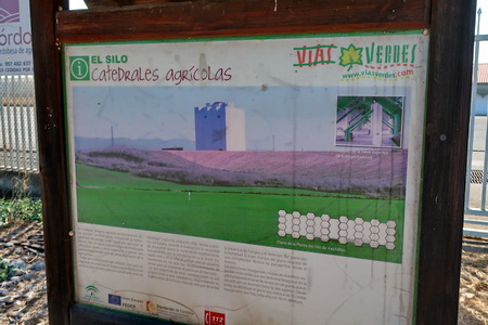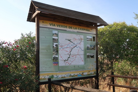 Kurz danach ist die Provinzgrenze Cordoba - Sevilla erreicht. Eine einsame Tafel erklärt die Via Verde auf dem Gebiet von Sevilla. Der Ort Carlota (Cordoba) ist 7,8 km auf der Straße entfernt vom ehemaligen Bahnhof. Hier beginnt der zweite Abschnitt der Via Verde de Campiña. Nach Ecija sind es noch 24,5 Fahrradkilometer.