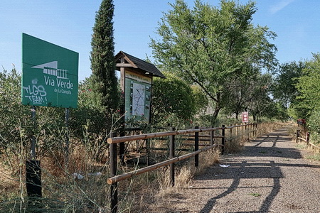 An der Straße steht ein unlesbarer, abgeblätterter Wegweiser zur Vía Verde. Dann aber steht man vor dem Beginn der Strecke. Auf dem verschmutzten Areal befindet sich auch eine Übersichtskarte.