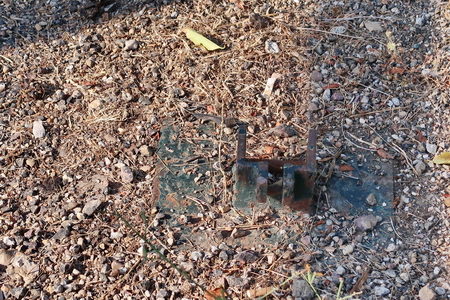 Es geht los, aber Augen auf! Reste alter Pfostensperren und evtl. auch andere Hindernisse befinden sich mitten auf der Fahrbahn - kein seltenes Phänomen, auch bei unseren Radwegen! Die Entfernungsangaben sind noch lesbar, trotz der Schmierereien.