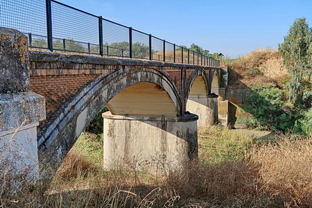 Die Brücke über den Río Guadajoz mit drei steinernen Bögen. Blick zurück: Am Horizont erkennt man noch den Getreidesilo von Valchillón.