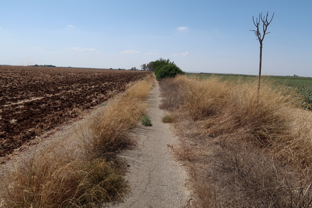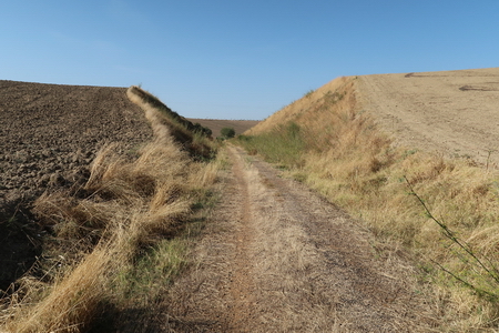 Der Radweg führt weiter geradeaus durch die trockenen, bereits umgepflügten Felder.