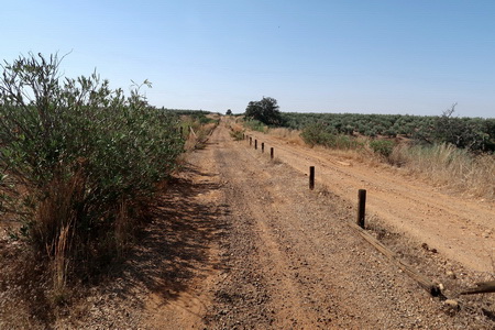 Die Vía Verde hat nun ordentlich an Höhe gewonnen, und der Blick in die Ebene ist frei. Der Radweg parallel zu einer Autospur führt kerzengerade Richtung Las Pinedas. In diesem Gebiet dominieren die Olivenbäume.