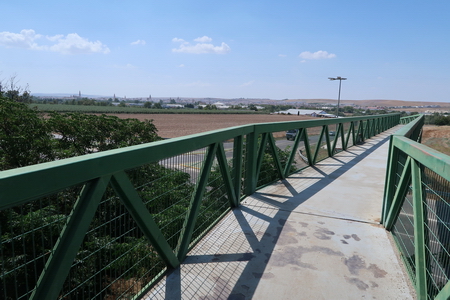 Eine schattige Allee führt zu einem Rastplatz, ein eiserner Steg hilft bei der Überquerung der A-453.