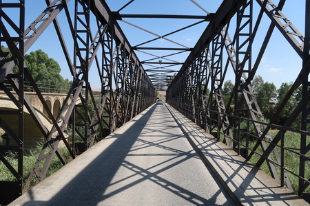 Ihre jüngere Nachbarin, die Steinbrücke aus dem Jahr 1945, ebenfalls einst für die Eisenbahn gebaut, versorgt heute den Autoverkehr in der Gegenrichtung.